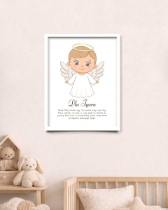 Ta urocza ramka z delikatnym aniołkiem oraz modlitwą „Aniele Boży, Stróżu mój…” to wyjątkowy sposób, by uczcić ten szczególny moment. Na ramce znajduje się miejsce na imię dziecka dzięki czemu staje się ona osobistą, niepowtarzalną pamiątką. To nie tylko dekoracja do pokoju maluszka, ale przede wszystkim symbol opieki, bezpieczeństwa i miłości, która będzie towarzyszyć mu każdego dnia.