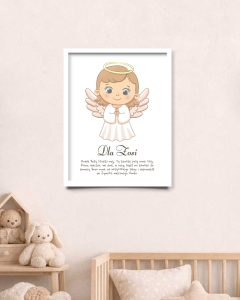 Ta urocza ramka z delikatnym aniołkiem oraz modlitwą „Aniele Boży, Stróżu mój…” to wyjątkowy sposób, by uczcić ten szczególny moment. Na ramce znajduje się miejsce na imię dziecka dzięki czemu staje się ona osobistą, niepowtarzalną pamiątką. To nie tylko dekoracja do pokoju maluszka, ale przede wszystkim symbol opieki, bezpieczeństwa i miłości, która będzie towarzyszyć mu każdego dnia.
