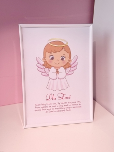 Ta urocza ramka z delikatnym aniołkiem oraz modlitwą „Aniele Boży, Stróżu mój…” to wyjątkowy sposób, by uczcić ten szczególny moment. Na ramce znajduje się miejsce na imię dziecka dzięki czemu staje się ona osobistą, niepowtarzalną pamiątką. To nie tylko dekoracja do pokoju maluszka, ale przede wszystkim symbol opieki, bezpieczeństwa i miłości, która będzie towarzyszyć mu każdego dnia.
