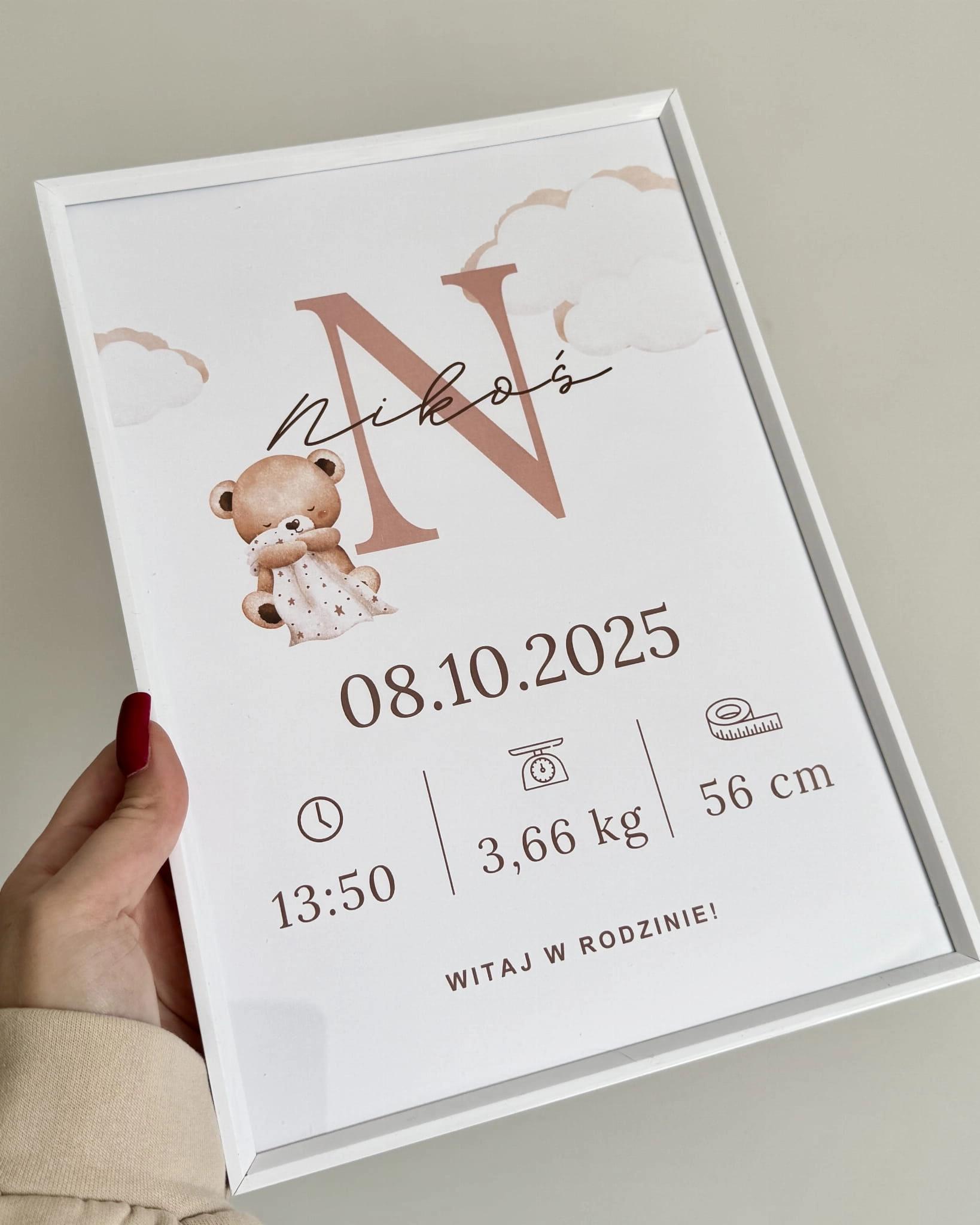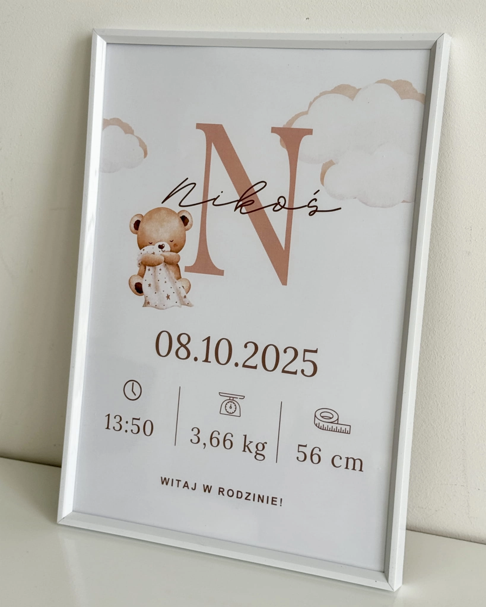 Ta urocza metryczka dla dzidziusia to piękny sposób, by zatrzymać wspomnienie tego niezwykłego dnia na zawsze. Subtelna, delikatna grafika i staranne wykonanie sprawiają, że staje się ona nie tylko dekoracją dziecięcego pokoju, ale przede wszystkim sentymentalną pamiątką na całe życie.