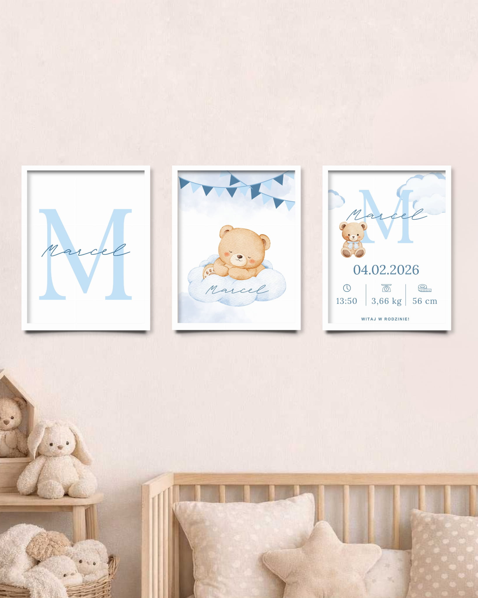 Ten zestaw trzech ramek to harmonijna dekoracja do pokoju dziecka, która łączy w sobie estetykę i sentymentalną wartość. Starannie dopasowane grafiki tworzą spójną kompozycję, idealną nad łóżeczkiem, komodą czy w kąciku maluszka.