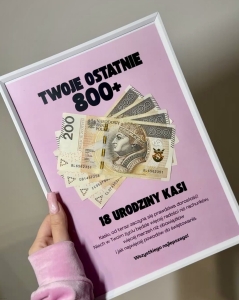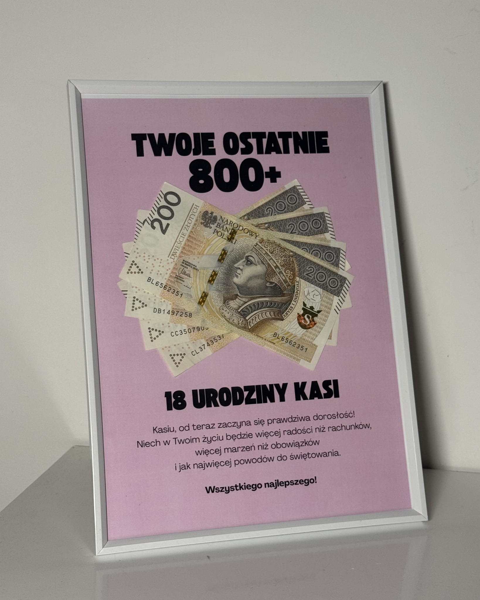 Ramka „Ostatnie 800+” to ciekawy sposób na wręczenie pieniędzy na osiemnastkę w bardziej kreatywnej formie niż zwykła koperta. Nawiązuje do tego momentu z przymrużeniem oka, a jednocześnie symbolizuje wejście w dorosłość.