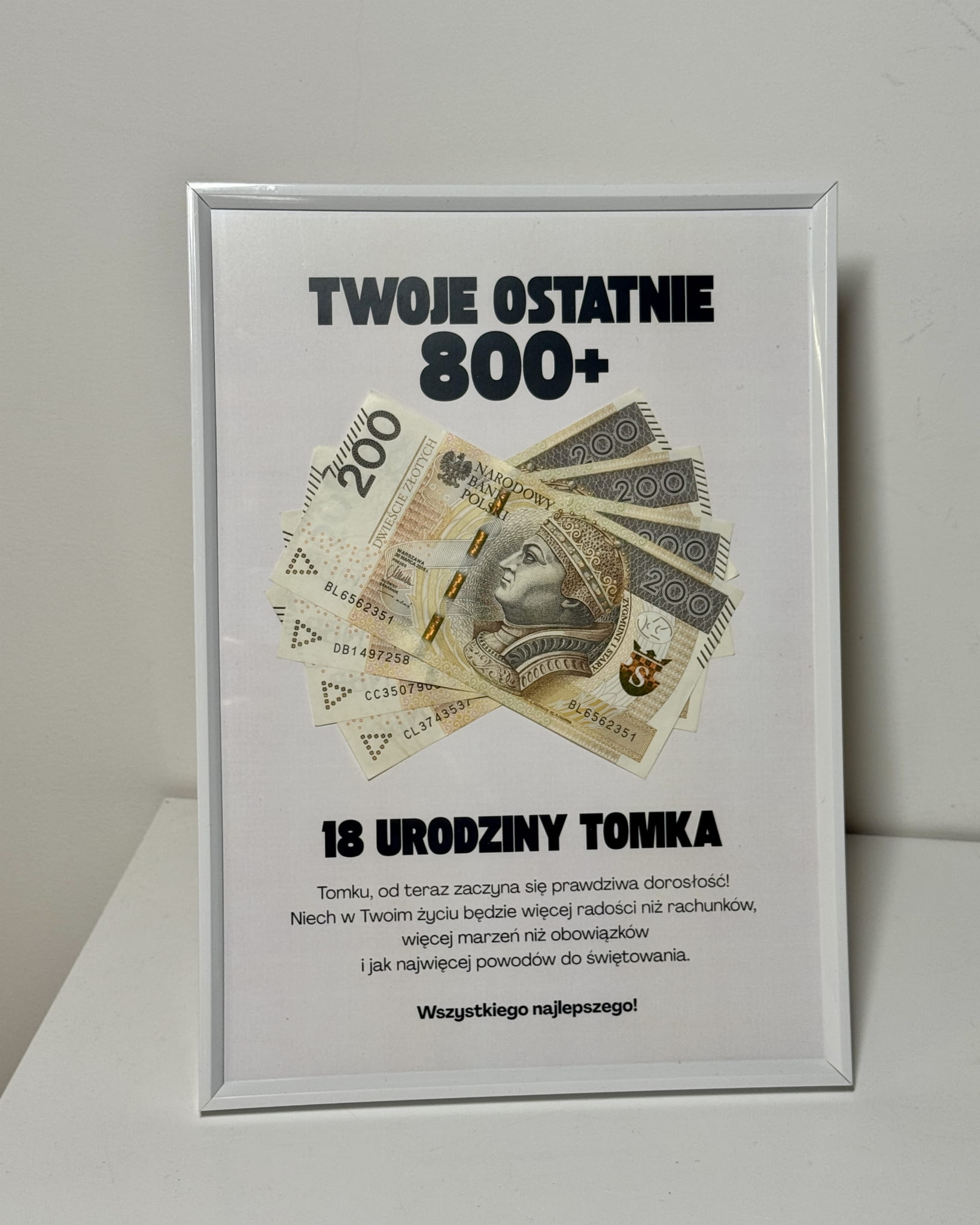 Ramka „Ostatnie 800+” to ciekawy sposób na wręczenie pieniędzy na osiemnastkę w bardziej kreatywnej formie niż zwykła koperta. Nawiązuje do tego momentu z przymrużeniem oka, a jednocześnie symbolizuje wejście w dorosłość.